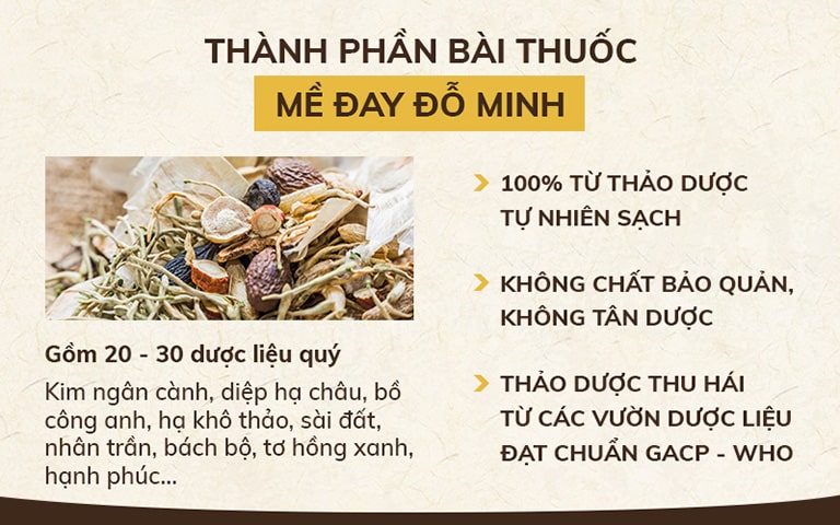 Bài thuốc nam gia truyền của Đỗ Minh Đường tổng hòa từ hơn 50 thảo dược có công dụng thanh nhiệt, giải độc, tiêu viêm, mát gan, dưỡng huyết… được kiểm chứng về độ an toàn, lành tính với bà bầu. 100% thành phần là các vị thuốc nam có trong nước được trồng theo mô hình hữu cơ tại 3 vườn dược liệu đạt chuẩn GACP-WHO do chính nhà thuốc Đỗ Minh Đường xây dựng, phát triển.