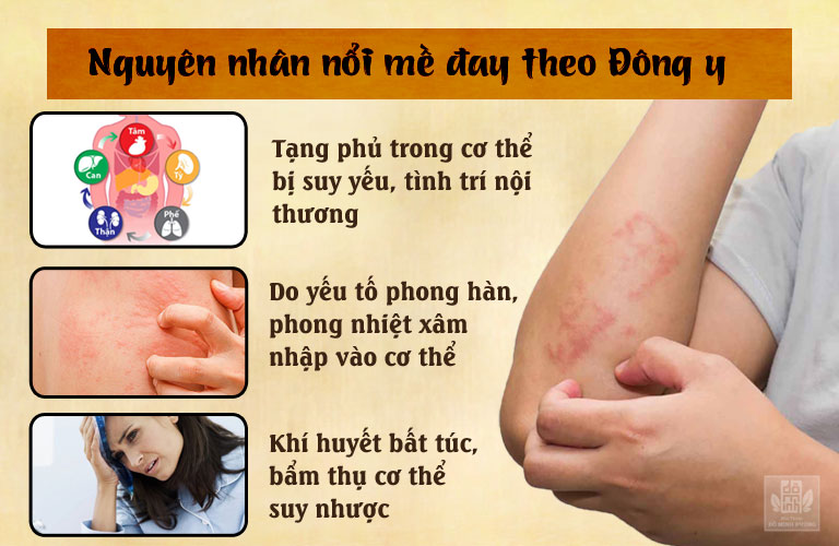 Đã xác định được chứng bệnh thì việc phát hiện nguyên nhân cũng không hề khó. Bằng việc trao đổi với người bệnh, theo dõi thể trạng và tình trạng mề đay, cố lương y đã tổng hợp được căn nguyên chính đến từ yếu tố nội nhân, tức là cơ thể suy nhược, khí huyết tổn hao, dẫn tới các tạng thận, gan dần giảm chức năng, không lọc được độc tố để đào thải ra ngoài mà để tích tụ trong cơ thể – khí huyết bất túc, vệ khí bất hòa, lâu dần uất tích tại bì, phát ban ra ngoài da.